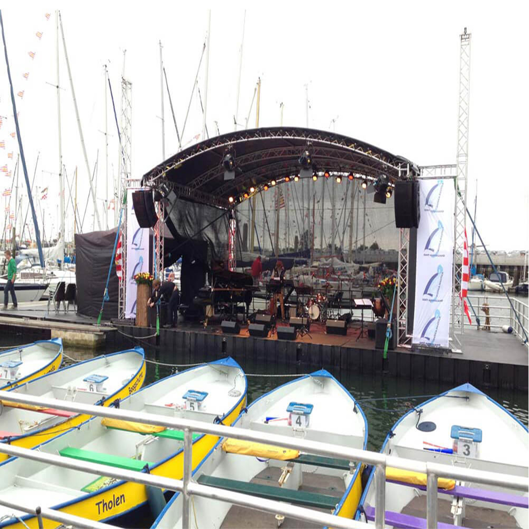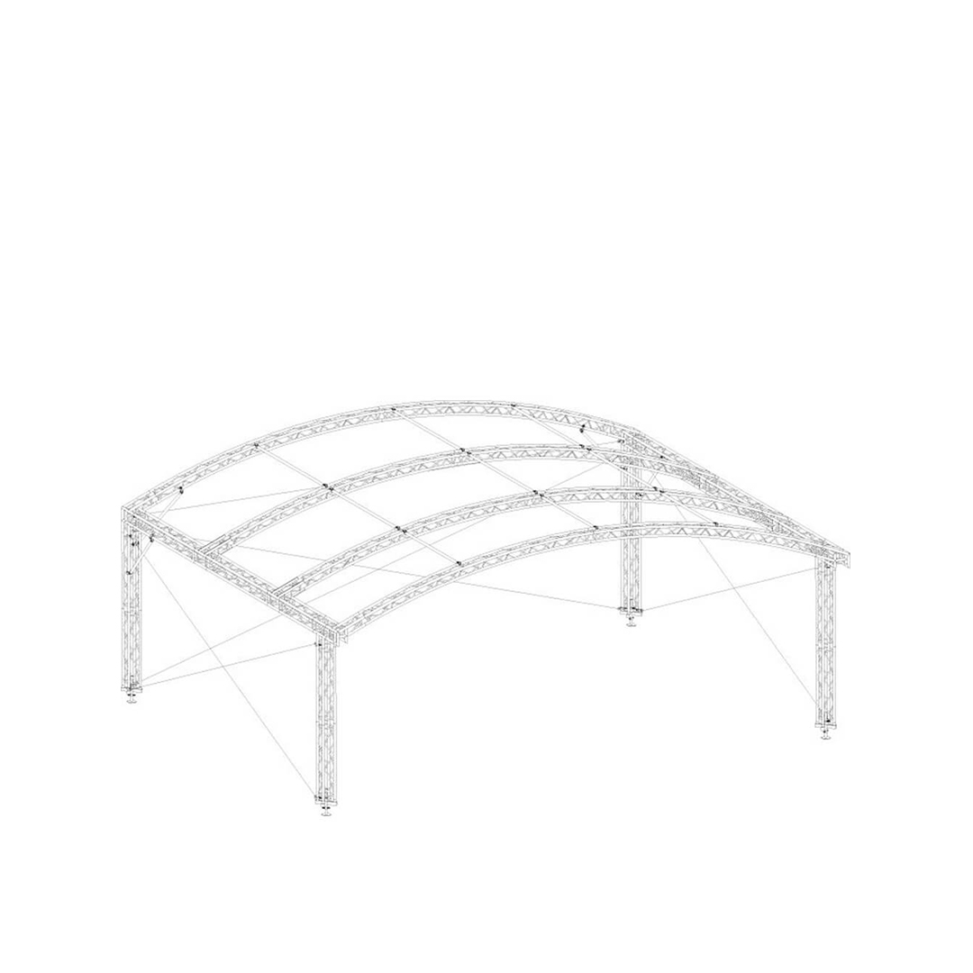 The arched roof structure consist of standard HD/FD34 mast truss sections on special small bases. Integrated jacks and a few special corners assures the fit for the triangular FD/HD33 arches. Between the arches standard hook on bars are required for extra stability and to support the canopy. Available in different sizes -The AR-10 Arc Roof comes in various dimensions 10x8m, 8x6m, 8x4m and 6x4m and all roofs are available in FD or HD Version. The top canopy is tightened with tubes and ratchet straps and the wall canopies can be either in full PVC or the wind through mash.The AR-10 Arc Roof is on many occasions the perfect solution by its low self weight, minimum of volume, easy and fast manual set up by 2 persons and a nice appearance.