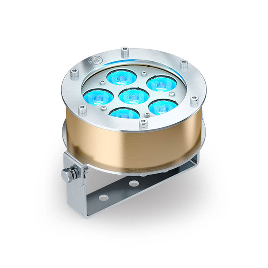 DIVE 6 FC is an IP68 underwater projector with 6 Full Color LEDs. The unit is fitted with an adjustable bracket or a round flange for recessed installation and it features a reinforced structure that makes it reliable for long-term use. The unit is available with different optics and it is suitable for medium underwater applications or for use outside water. The unit has been developed to work where safety regulations request 24 V DC max voltage, such as swimming pools or public areas. The unit is powered by DRIVENET 1664 or DRIVENET 832 24 V DC power supplies. Refer to local norms in case of underwater installation.